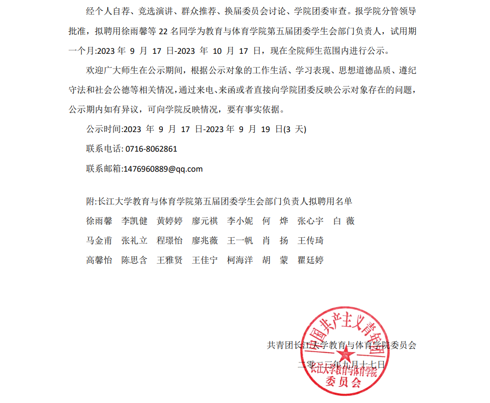 关于英国365上市公司第五届团委员工会部门负责人拟聘用名单的公示