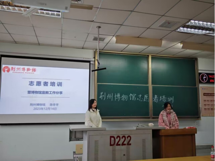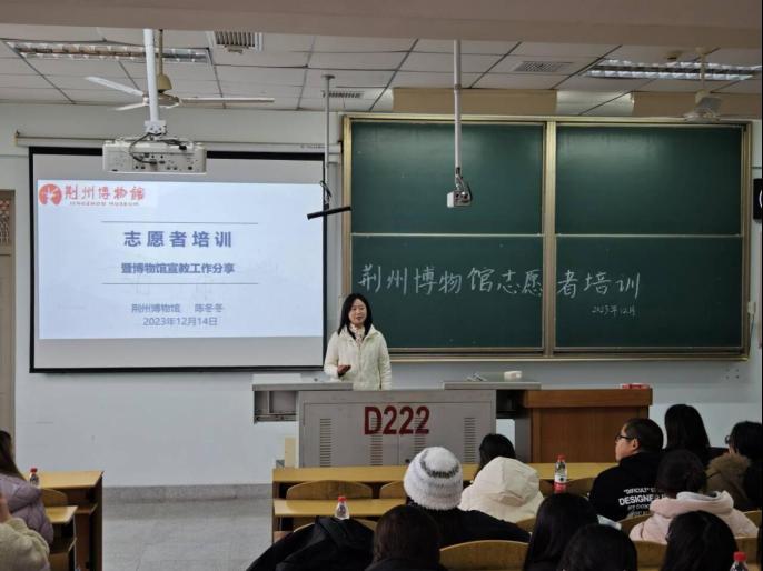 【通讯员 胡诗慧 刘雨薇 王传琦】冬藏万物,不御铅华亦不忘初心。为帮助志愿者们更好地了解博物馆讲解员的价值意义以及讲解员的具体要求,12月14日下午2时,英国365上市公司于东校区13教D222举办荆州博物馆讲解员志愿者培训活动。本次活动邀请了荆州博物馆宣教部主任陈冬冬老师作为主讲人,辅导员喻泽坤、任雯婷老师以及全体博物馆志愿者参会。活动由王然主持。