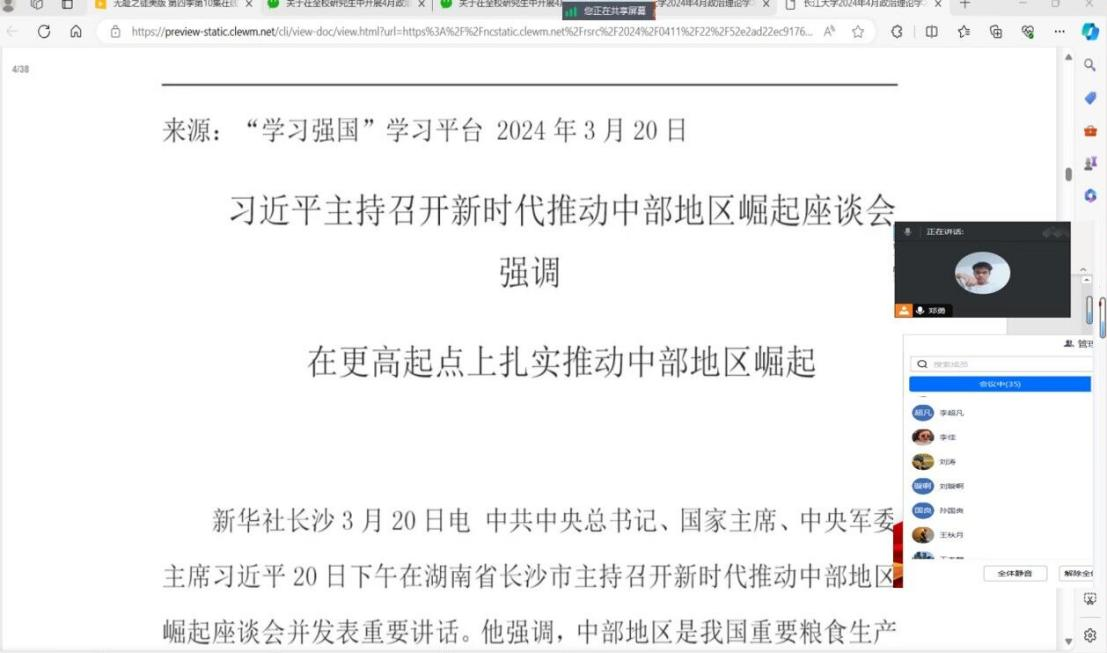 【通讯员 倪梓曦】2024年4月11日至29日,公司全体研究生开展了四月份政治理论学习。各班采用了线上与线下、集体学习与个人自主学习相结合的方式,由团支书进行组织,辅导员陈佳琳老师参与、督促学习。