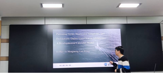接下来是黎浩同学,他就其英文文献“父母教养方式、抑郁症状和青少年问题性的网络游戏使用:发展性级联模型”作了汇报,主要从以下方面展开:社会现状和问题研究背景、相关概念界定、父母教养方式和青少年问题性的网络游戏使用等方面的影响因素,并根据压力缓冲模型进行研究,指出在一个领域的功能影响另一个领域的功能,随着时间的推移,影响会在各个领域扩散。随后呈现了研究假设模型图,紧接着向大家介绍了研究方法和研究结论,最后讨论了本研究存在的局限性和需要改进之处。