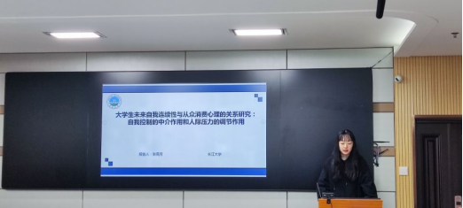 张竞月汇报主题为《老员工未来自我连续性与从众消费心理的关系研究》,她通过问卷调查对452名老员工的未来自我连续性和理性从众消费心理之间的关系进行了研究,并分析自我控制的中介作用和人际压力在中介后半段的调节作用。研究结果发现,未来自我连续性高的老员工,自我控制水平更高,更容易产生理性的从众消费,自我控制的中介作用显著。这可能是因为未来自我连续性越高,自我控制能力越强,相对于短期利益,更可能进行有利于长期发展的决策(如理性的从众消费)。但人际冲突压力在自我控制对从众消费影响中的调节作用不显著,这还需要进一步的思考。老师点评环节,首先是郑老师就研究设计中自我连续性和从众消费带来的影响进行了探讨。其次是冯老师对研究的自变量之间的关系提出了建议。