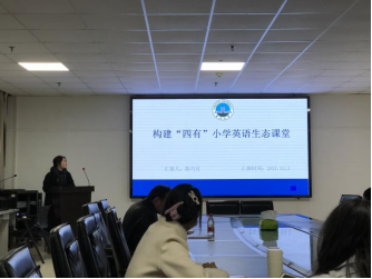 首先是陈巧月同学,她就“构建‘四有’小学英语生态课堂”做了专题报告。陈巧月同学从研究背景入手,讲解了新课程理念的生态化取向以及小学英语课堂的生态学反思,并讲解研究意义以及国内外研究现状,随后汇报了研究内容、研究结果和研究不足。潘友刚、王家奇老师就陈巧月同学对四有课堂特征的挖掘给予了肯定,也提出了应增加对生态课堂的挖掘的建议。