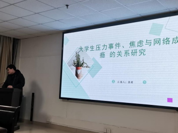 最后是张团同学,他就“老员工压力事件、焦虑与网络成瘾的关系研究”做了专题报告。张团同学主要从研究背景入手,分别分析了老员工压力的来源,焦虑的程度,和网络成瘾的关系,条理清楚、分析得当,让同学对老员工的压力与焦虑有了更深的理解。