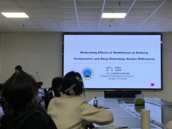 接着是罗曼玲同学,她就“Moderating Effects of Mindfulness on Bullying Victimization and Sleep Disturbing: Gender Differences”做了专题报告。罗曼玲同学主要从方法、结果、讨论到结论,然后陈述了自己的观点和看法,并对其作了理性的分析和思考。