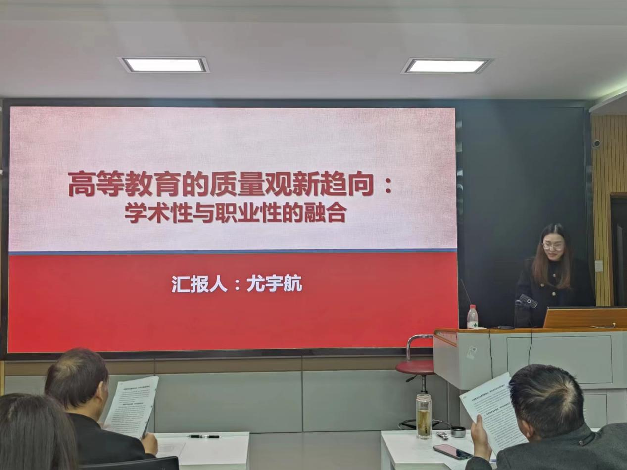 尤宇航汇报的主题为《高等教育的质量观新趋向:学术性与职业性的融合》。她指出我国高等教育已进入普及化阶段,居于主导地位的学术性高等教育质量观亟待变革,并以博耶的大学术观作为理论基础,提出学术性和职业性的融合是我国未来高等教育质量观的重要走向。