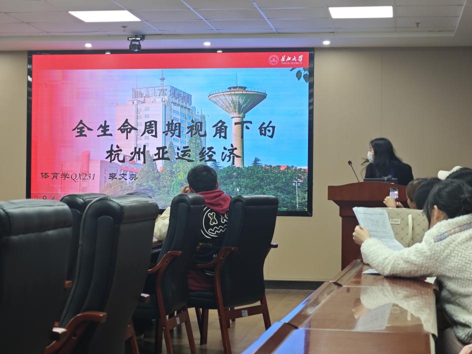 李文奕汇报的主题是《全生命周期视角下的杭州亚运经济》,她以杭州亚运会为例,阐明体育赛事产业是推动城市经济增长的绿色产业,大型体育赛事能够为城市经济增长带来多方面多维度的巨大社会效益和经济效益,但对大型赛事的过度投入则极大可能拖垮当地财政经济,利用生命周期理论构建关于杭州亚运会的经济模型并对其进行分析和研究。让同学们在一个全新的视角下认识到了杭州亚运会体育赛事产业发展的总趋势和未来发展方向。