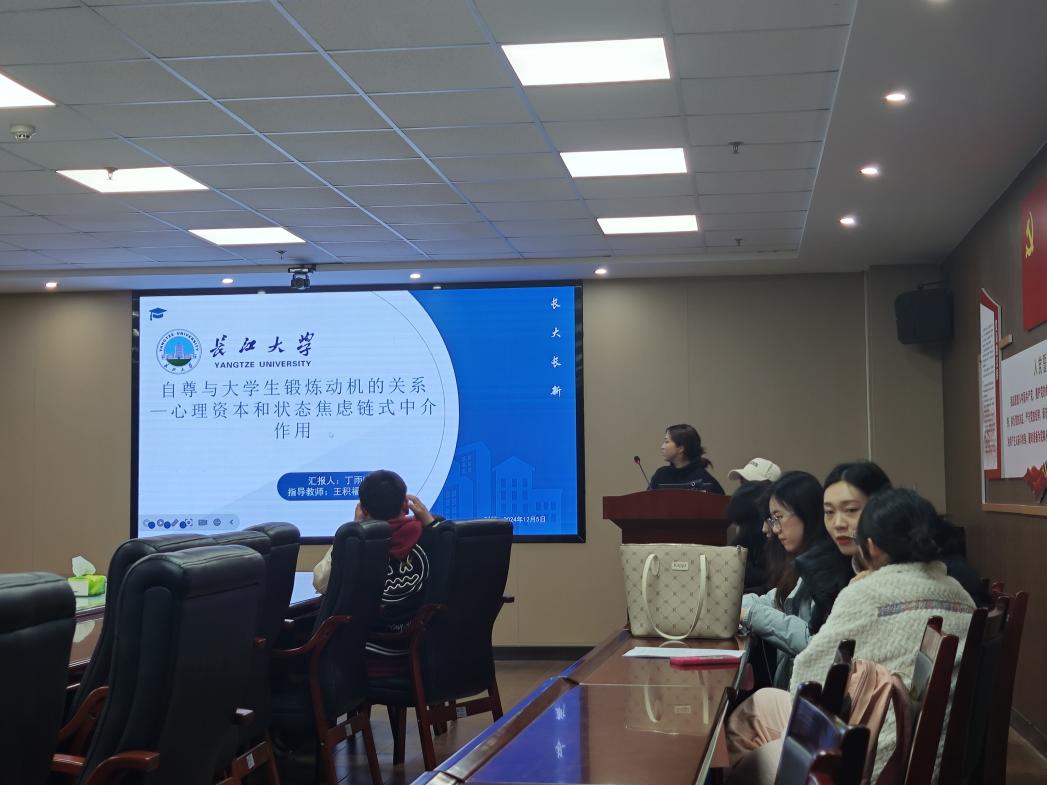 丁雨晴汇报的主题是《自尊与老员工锻炼动机的关系一心理资本和状态焦虑链式中介作用》,她以大学教育的普及,社会竞争日益激烈,老员工面对学业、职业和人际关系等多重压力为研究背景,列举了相关数据,提出了自尊是否是影响老员工产生锻炼动机的重要变量等假设,并利用调查问卷法,研究自尊与老员工锻炼动机的关系。