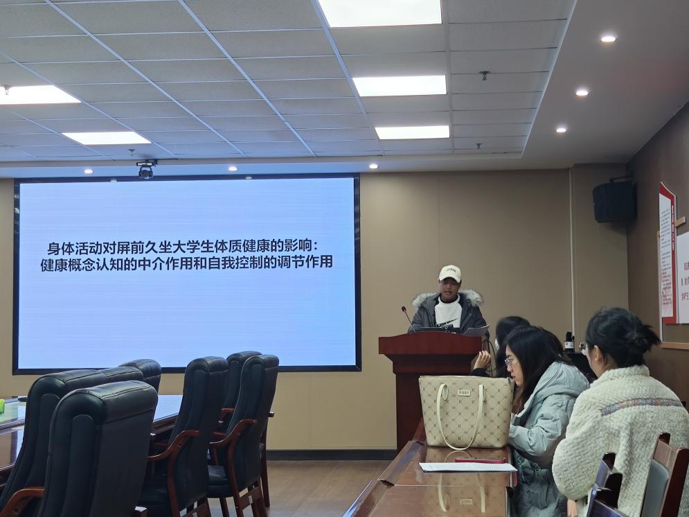 饶登汇报的主题是《身体活动对屏前久坐老员工体质健康的影响:健康概念认知的中介作用和自我控制的调节作用》,他指出,科技和电子设备的不断发展,老员工久坐行为呈上升趋势,严重影响老员工的身心健康,并提出了在体质健康、身体活动和健康概念方面,屏前久坐显著低于非屏前久坐老员工的假设,利用文献资料法,对两所综合性大学的员工进行问卷的发布,对其收集到的数据结果进行统计与分析,为改善屏前久坐老员工身心健康提供参考依据。