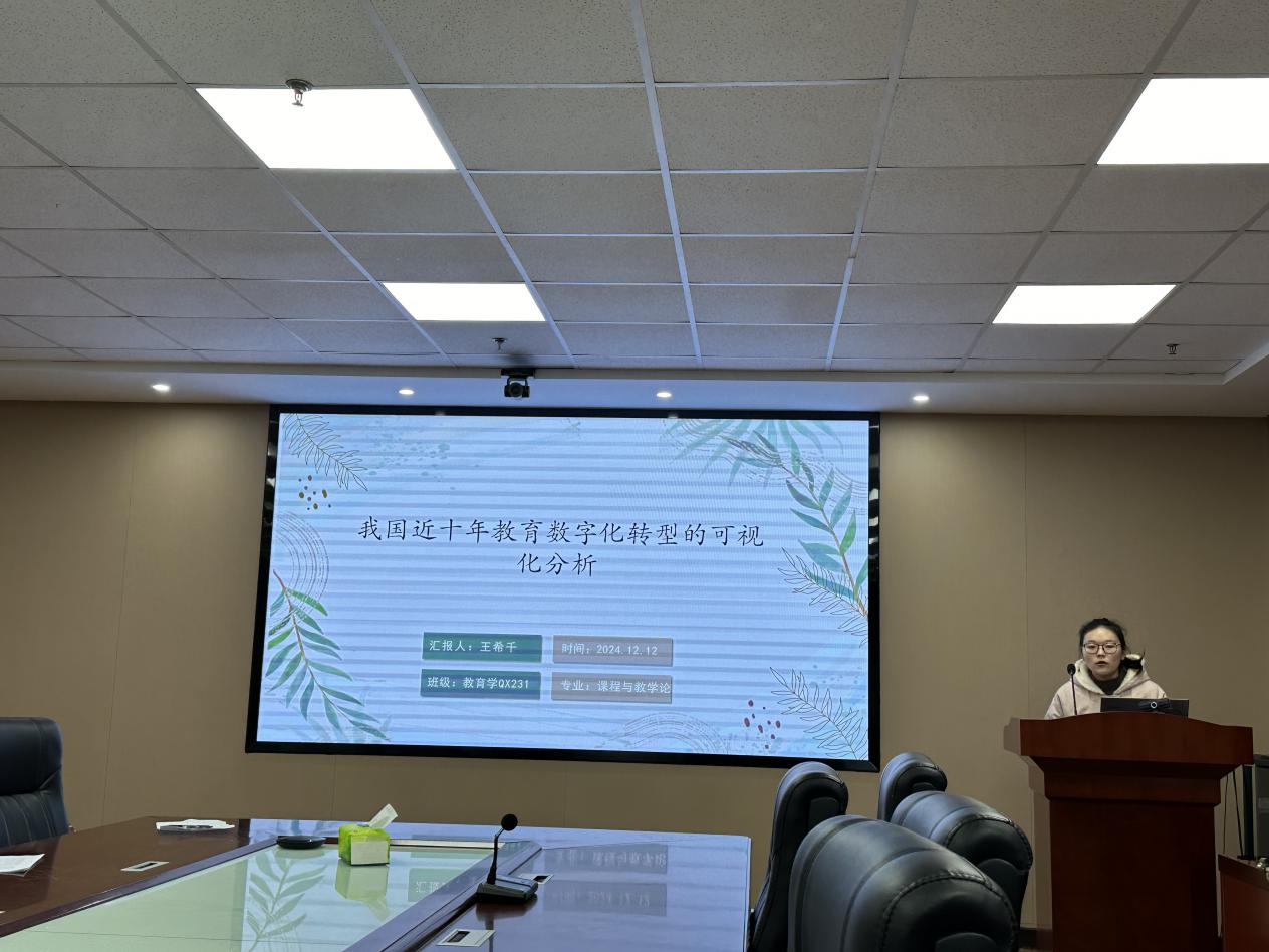 随后,王希千汇报的主题是《我国近十年教育数字化转型的可视化分析》,她以我国于2022年初开始实行教育数字化转型战略,以及2023年习近平总书记强调教育数字化对教育现代化的重要性作为选题背景,利用文献资料法对于之相关的文献进行检索,通过筛选与排除最终得到413篇文献作为可用文献,她指出,在线教育的发展突破了传统教育对于地域和时间的限制,实现了教育资源的共享,提升了学习效率。需要打造高水平数字化教师队伍,助推教育数字化全面改革,并深化教育数字化转型理念,推进数字化转型纵深发展。