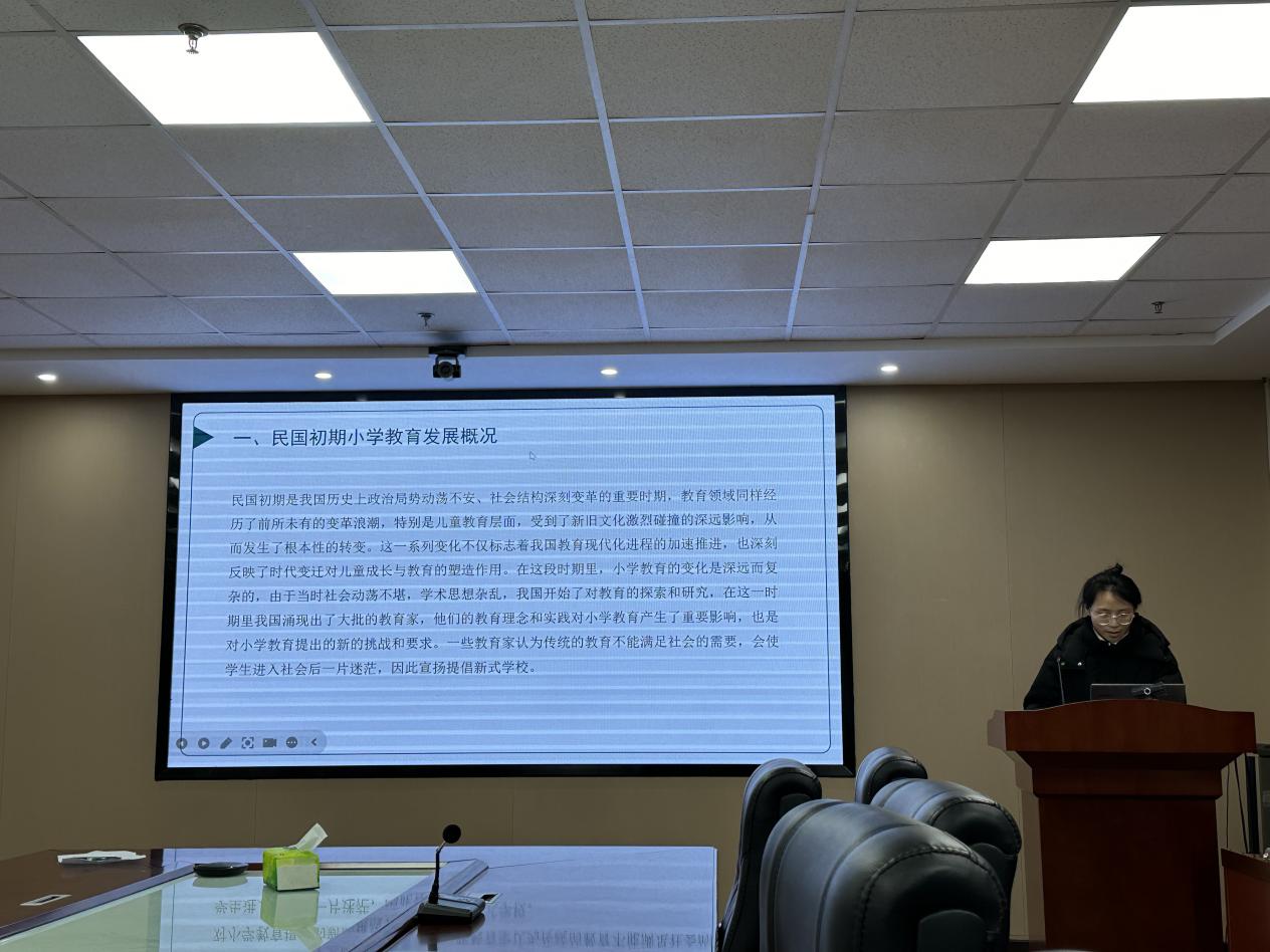 王超冉汇报的主题是《民国初期私塾与新式小学公司教育的比较研究》,她以民国初期小学教育发展概况为研究背景,表明当时的教育家提倡建立新式公司,并从民国政策、教育思想、社会发展变革等方面出发,呈现出人们对教育的重视程度有所提升的变化趋势,启示着我们更系统更全面的看待现代教育,提出更为有效的举措继续发展现代教育。
