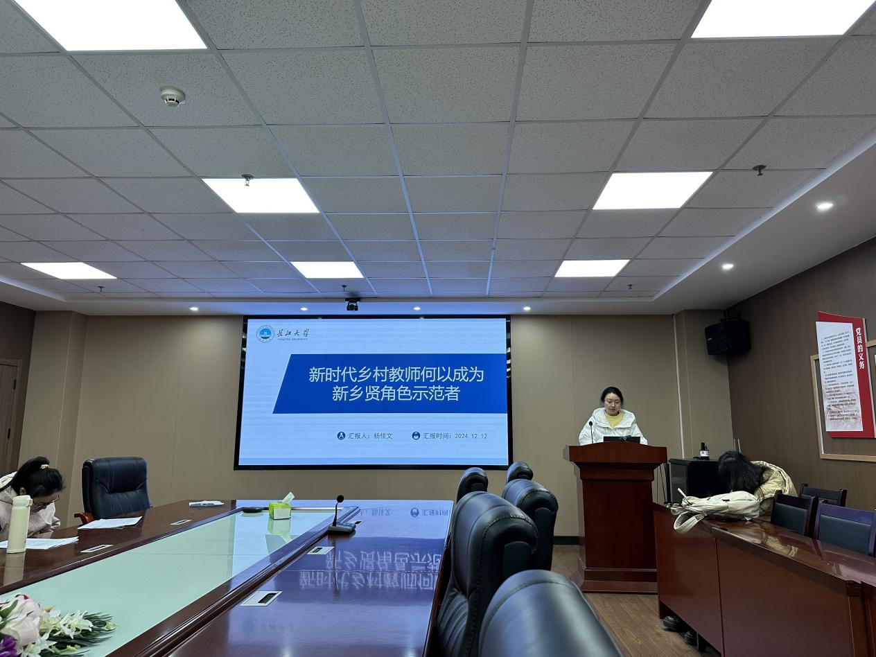 最后,杨佳文汇报的主题是《新时代乡村教师何以成为新乡贤角色示范者》。首先,她通过阐述20世纪某些著名教育家针对乡村发展落后以及教育水平低下等状况探讨了乡村教师的角色和功能,指出乡村教师既承担着提升乡村教育品质的重任,同时也是乡村中的乡贤代表,在乡村建设过程中起到示范作用。随后对乡村教师新乡贤角色示范者的定义、为什么要成为乡村教师新乡贤角色示范者、怎样成为乡村教师新乡贤角色示范者展开阐述。