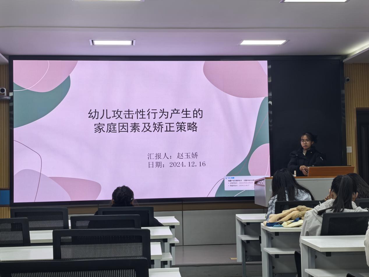 最后,赵玉娇汇报的主题是《幼儿攻击性行为产生的家庭因素及矫正策略》。首先,她先阐述了幼儿攻击性行为的内涵以及分类,之后结合幼儿阶段的生理和心理的发展特征指出幼儿攻击性行为存在的原因和特点,并借助于社会学习理论、信息加工理论模型系统分析幼儿出现攻击性行为的直接或间接影响因素。