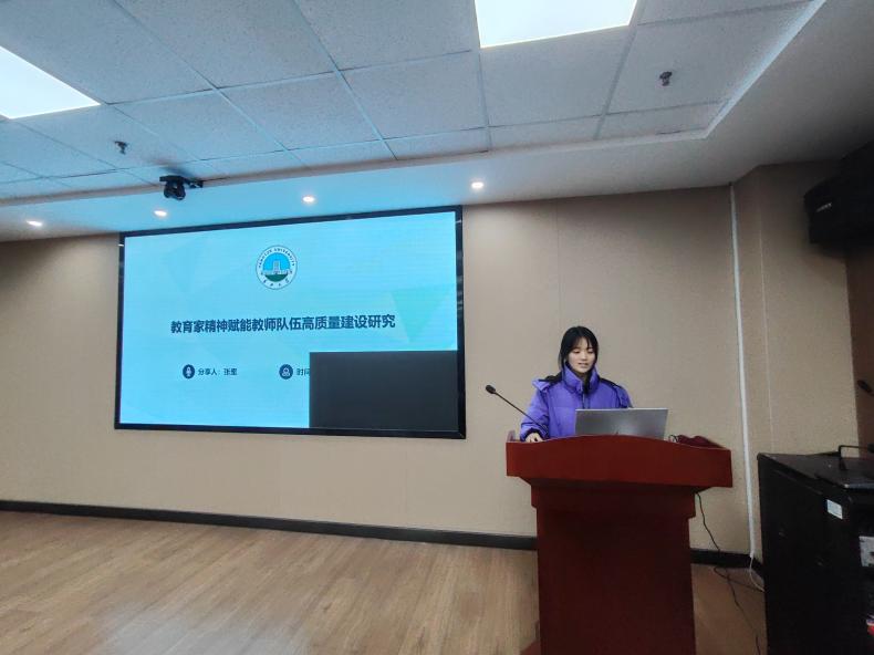 首先,张蜜在题为《教育家精神赋能教师队伍高质量建设研究》的汇报中,系统阐述了教育家精神的核心内涵,涵盖教育信仰、专业能力与人文关怀三个维度。她构建了“价值引领—能力提升—生态重构”的逻辑框架,指出教育家精神能为教师发展提供价值坐标、成长范式与文化重塑力量,并提出应从制度设计、资源整合、数字赋能等方面系统推进教师队伍高质量建设,旨在培养一支兼具高尚师德、精湛专业能力和深厚育人情怀的教育家型教师队伍。