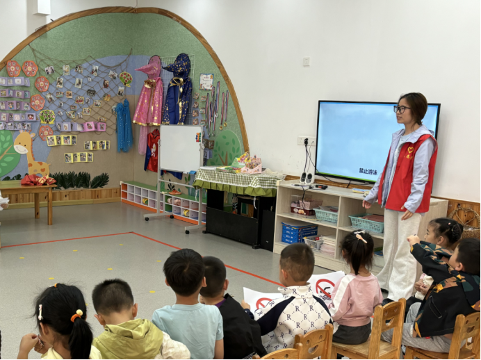接下来的知识讲解环节中,志愿者谭诗语结合图文并茂的PPT,用通俗易懂的语言向孩子们介绍了如何预防溺水、遇到危险时如何自救和他救等实用技能。讲解过程中,志愿者带领小朋友们一起念防溺水“六不准”,小朋友们声音洪亮,在念读中加深了对防溺水知识的印象。