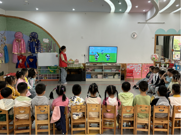 活动伊始,志愿者走上讲台,与小朋友们进行亲切互动,在友好地互动交流中,志愿者与小朋友们建立了融洽的关系,现场气氛轻松且活跃。彼此熟悉之后,志愿者精心准备的防溺水主题动画视频闪亮登场,动画视频瞬间吸引了小朋友们的注意力,激发了他们对活动的浓厚兴趣。