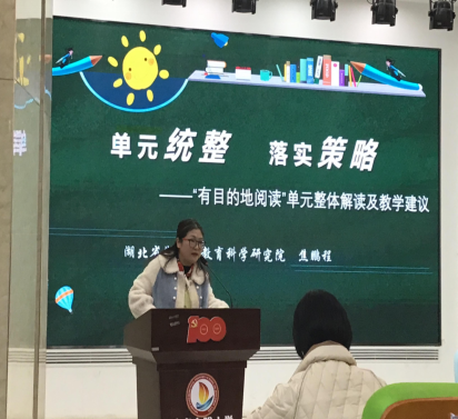 最后,荆州市教育科学研究院焦鹏程主任以“单位统整 落实策略”为主题,围绕语文阅读单元整体认识,分版块具体解读,相关教学建议三个部分展开论述。如何去分析语文教材?如何落实阅读策略?焦老师结合具体例子给我们阐述,由整体到部分,让我们对语文教学及主题单位的整体把控有了新的认识。