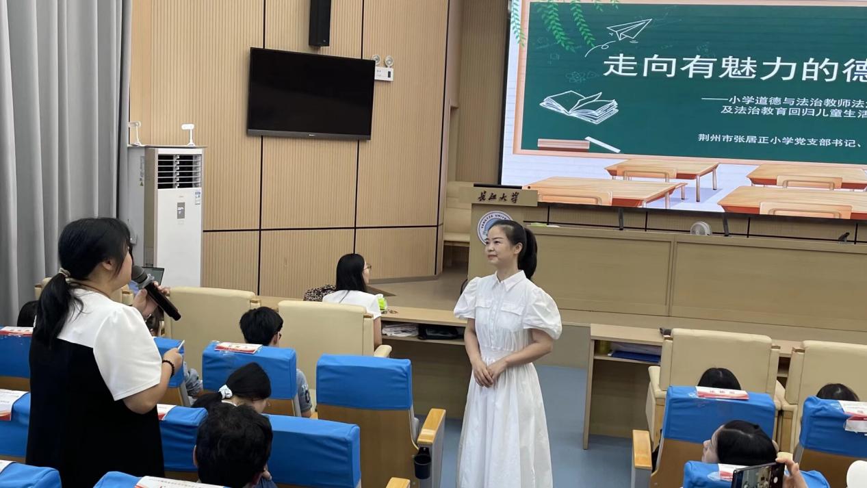 沙北实验小学汤娟董事长的讲座《走向有魅力的德育课堂——小学道法教师法治素养培育及法治教育回归儿童生活的研究》重点探讨了教师法治素养的提升以及如何将法治教育自然融入儿童生活,增强法治课堂教学的吸引力和实效性。