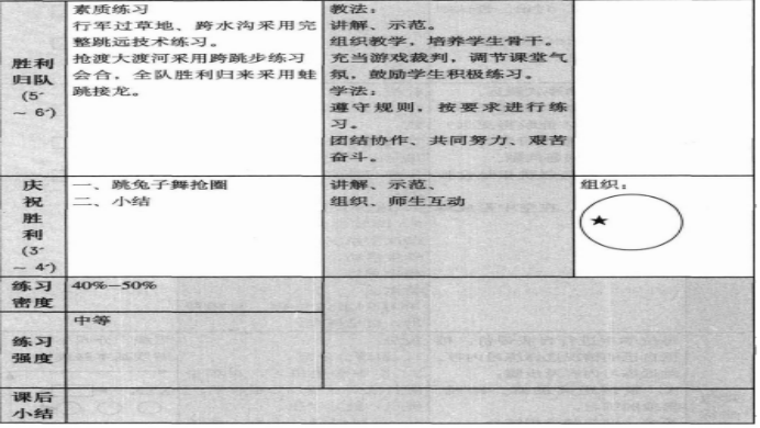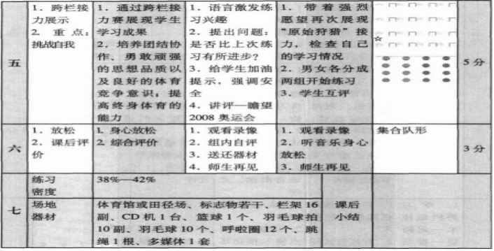 (4)检验学习成果,各组之间进行看谁的动作优美、技术动作合理、栏间节奏好的比赛,培养员工体育兴趣和团结协作、勇敢顽强的思想品质以及良好的体育竞争意识,提高终身体育的能力。