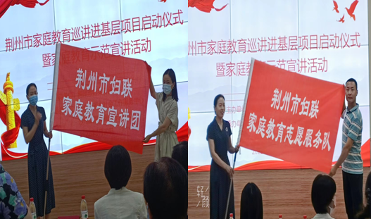 随后,市妇联党组成员、副主席李亚玲分别为荆州市妇联家庭教育宣讲团和荆州市妇联家庭教育志愿服务队授旗,荆州市家庭教育指导中心办公室主任王利方和荆州市100名家庭教育讲师公益成长计划发起方之一湖北悦辰心理咨询有限公司陈龙老师作为代表进行了接旗。